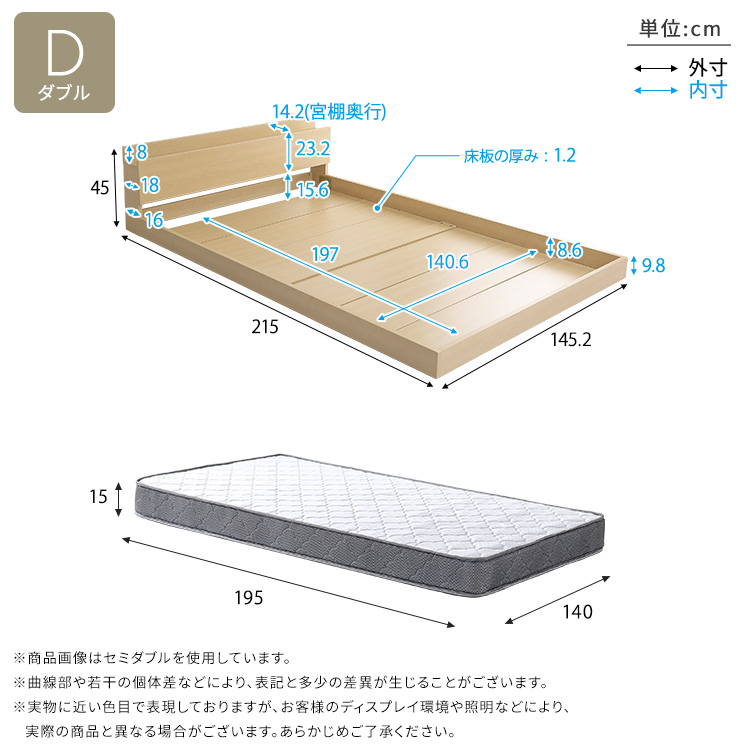 マットレスD:(約)幅140×奥行195×高さ15cm(コイル数:392個)