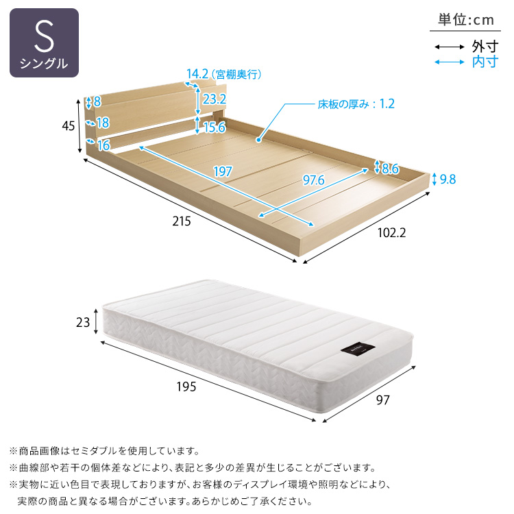 ベッドS:(約)幅102.2×奥行215×高さ45cm