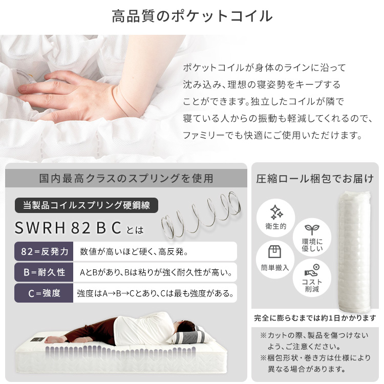 マットレス中材:ポケットコイル、ウレタン、防ダニ抗菌綿、不織布