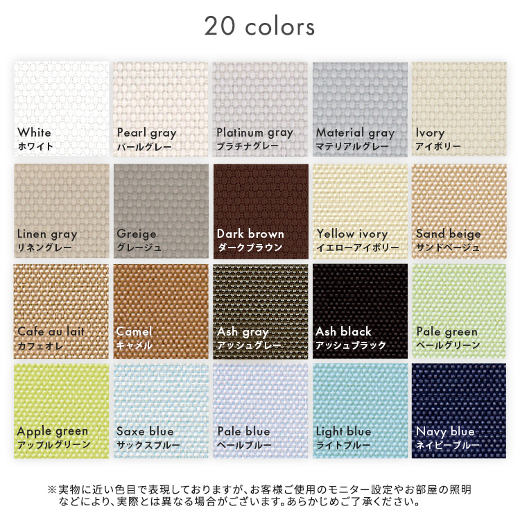 ホワイト、プラチナグレー、パールグレー、サンドベージュ、アイボリー、マテリアルグレー、カフェオレ、アッシュグレー、アップルグリーン、リネングレー、イエローアイボリー、グレージュ、ペールグリーン、ペールブルー、アッシュブラック、サックスブルー、ダークブラウン、ネイビーブルー、ライトブルー、キャメル