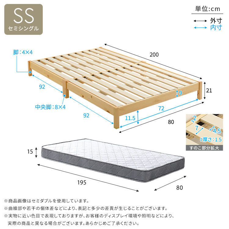 マットレスS:(約)幅97×奥行195×高さ15cm(コイル数:308個)