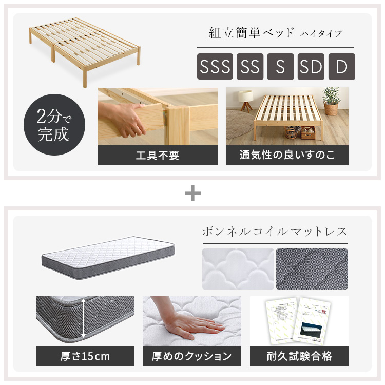 マットレスSSS:(約)幅80×奥行180×高さ15cm(コイル数:234個)