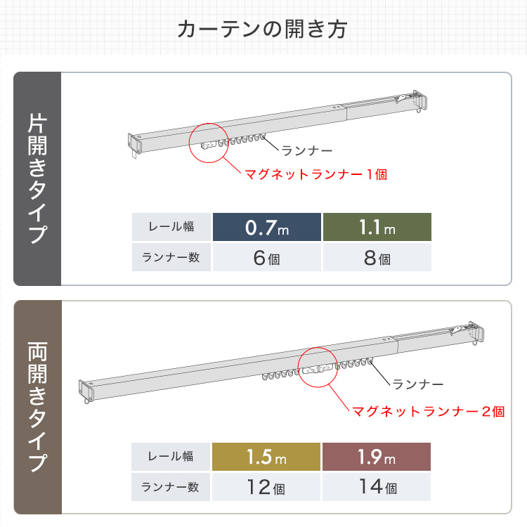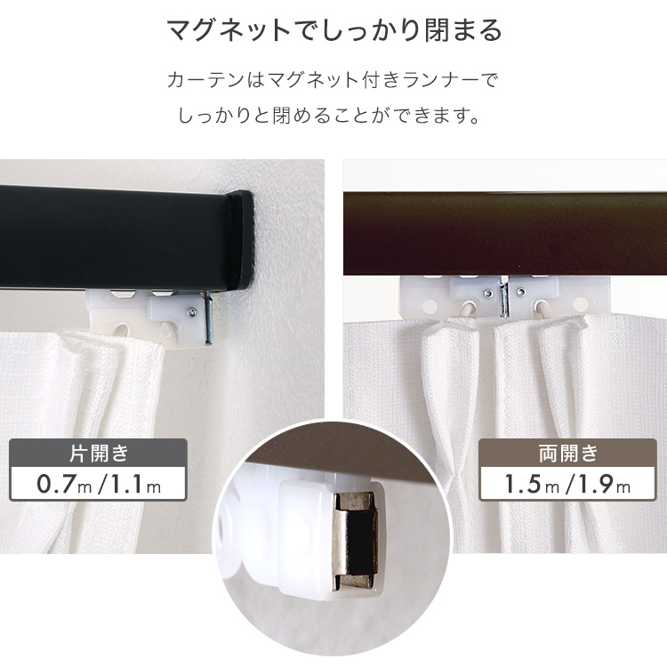 マグネットランナーがついておりカーテンを閉めた際に真ん中でピッタリ取り付けることができます!