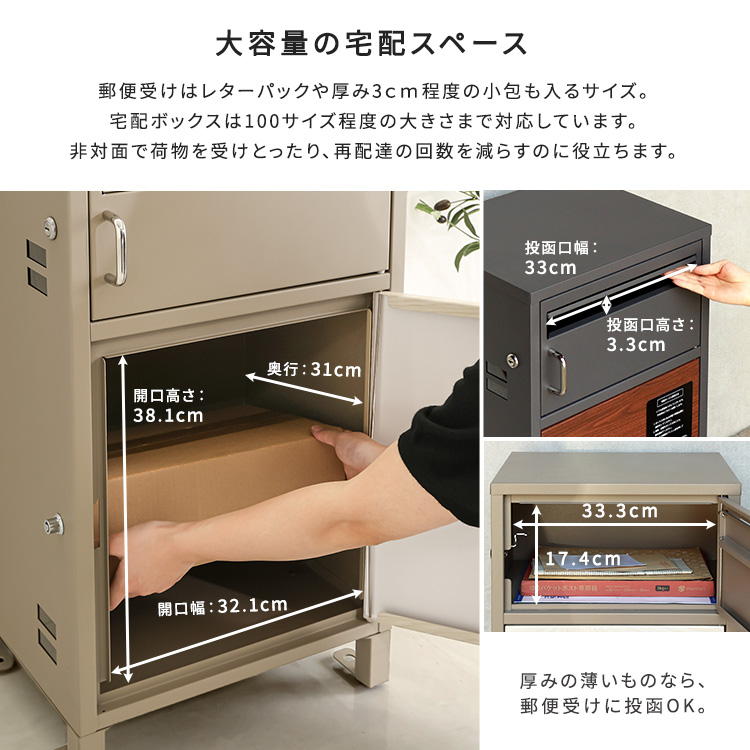 宅配用の収納が1段と宅配用としても使える大きめのポストが1段ありますので、大きい荷物と小さめの荷物であれば、配達が被っても安心です。