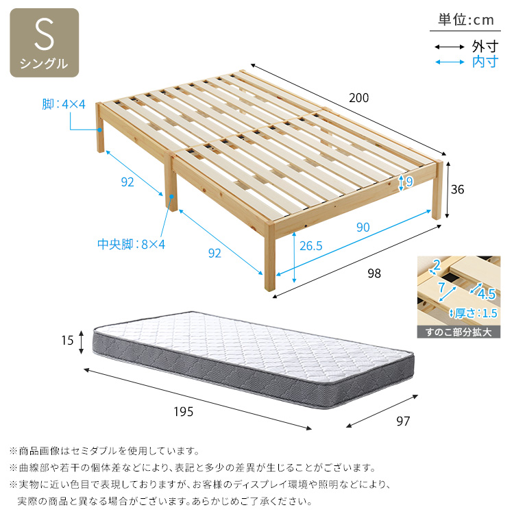 マットレスS:(約)幅97×奥行195×高さ15cm(コイル数:308個)
