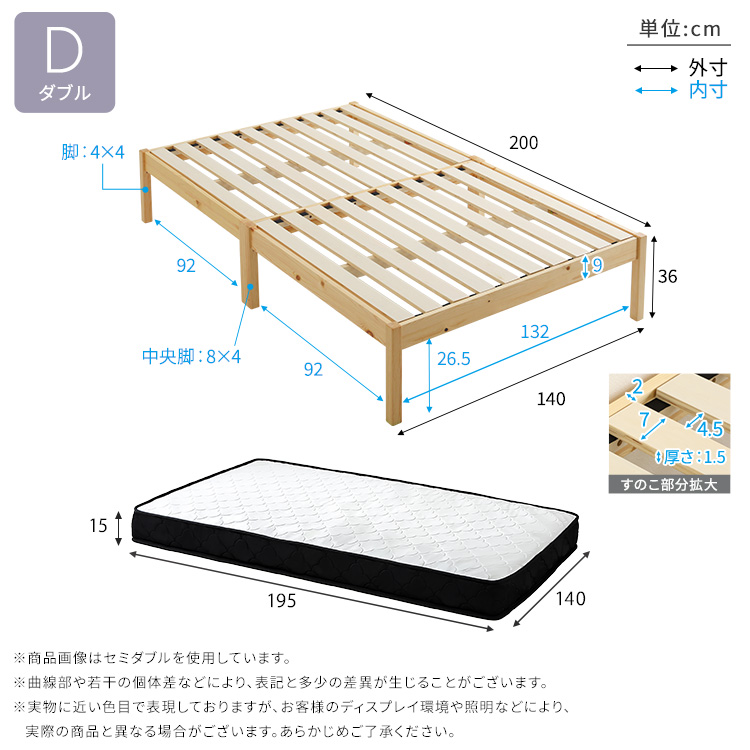 マットレスD:(約)幅140×奥行195×高さ15cm(コイル数:682個)